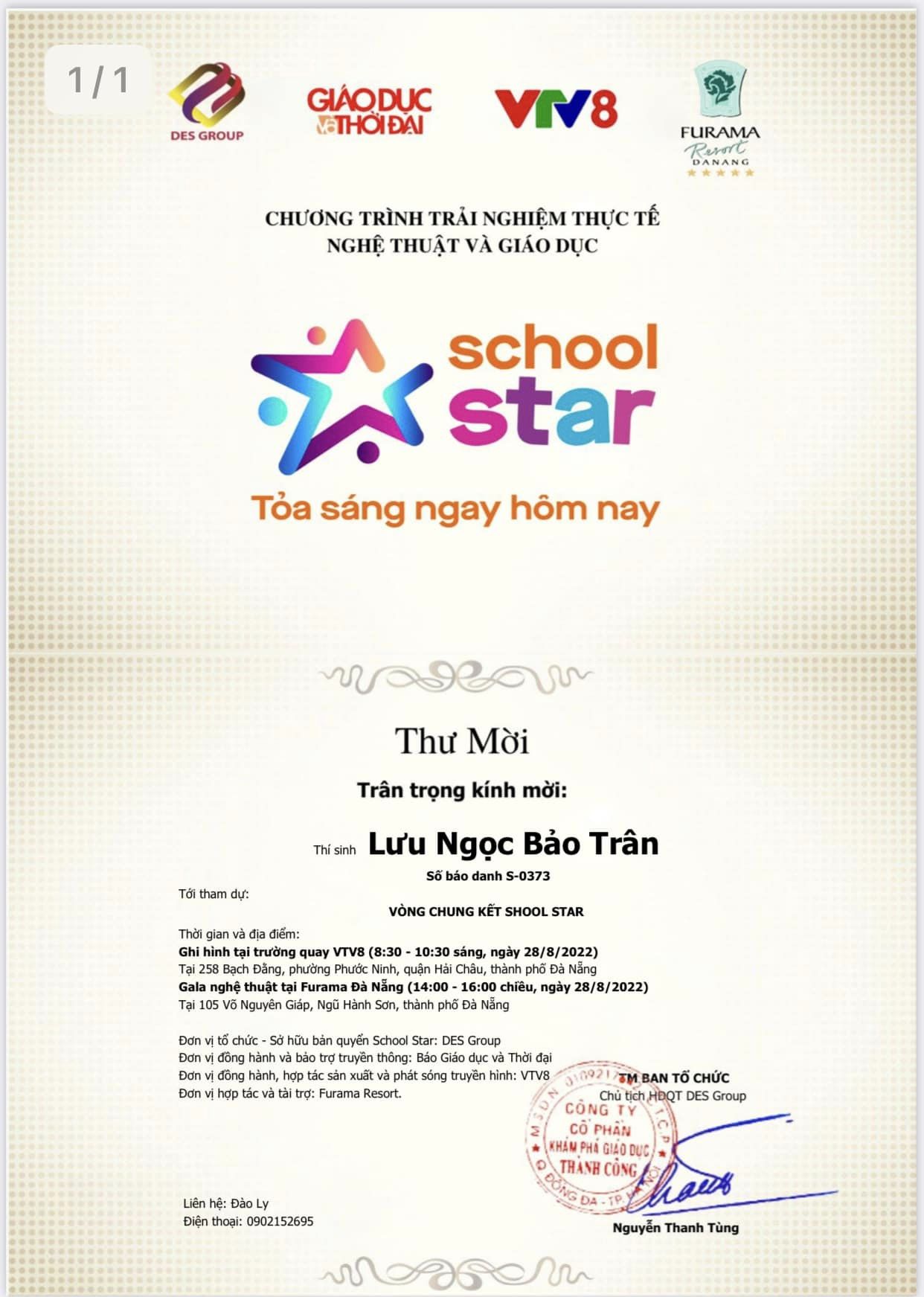 Chúc mừng bạn Lưu Ngọc Bảo Trân lớp 4A5 đã lọt vào chung kết chương trình School Star!