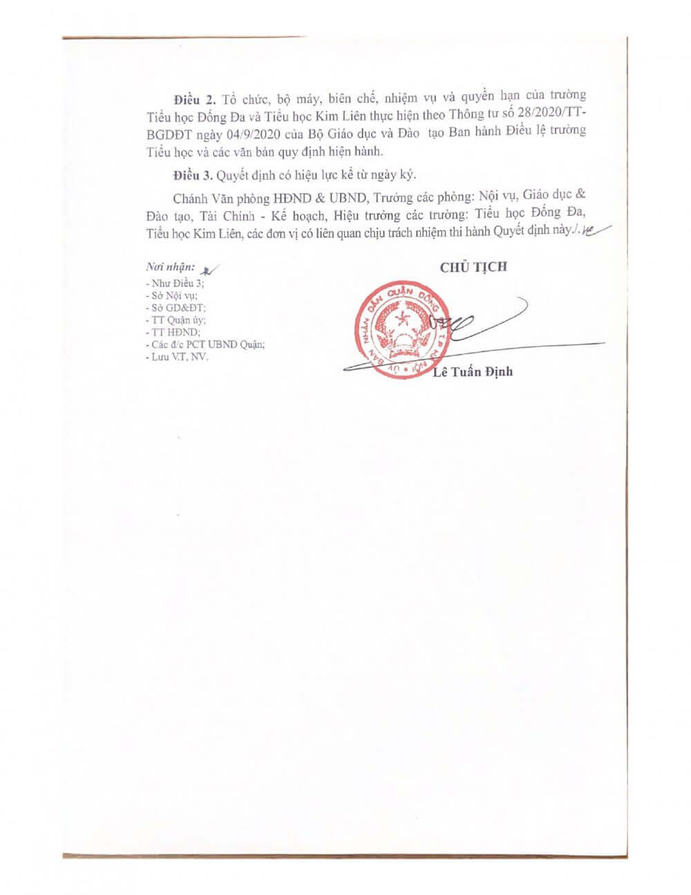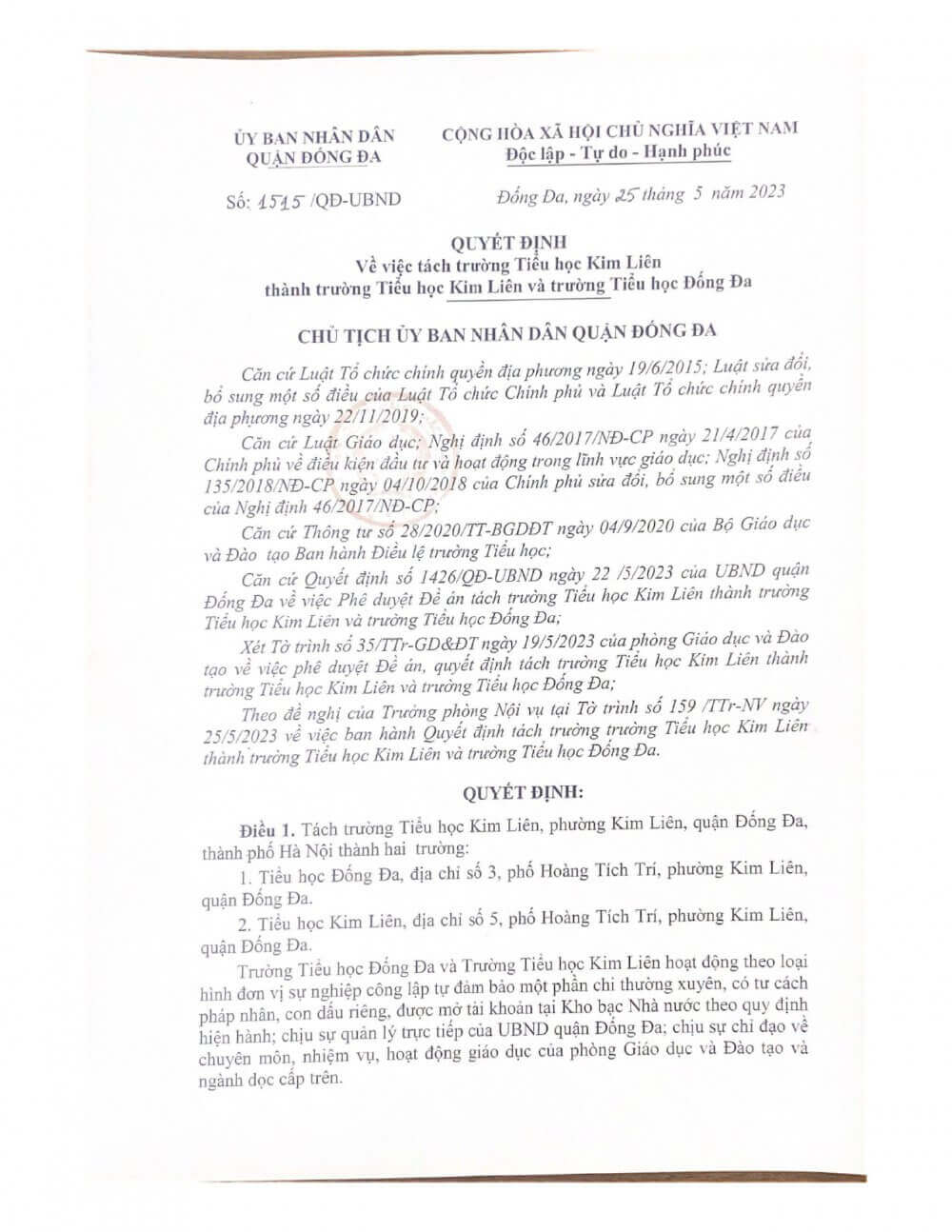 Thực hiện Quyết định số 1515/QĐ-UBND của Ủy ban nhân dân quận Đống Đa về việc tách trường Tiểu học Kim Liên thành trường Tiểu học Kim Liên và trường Tiểu học Đống Đa ngày 25/05/2023, trường Tiểu học Kim Liên xin thông báo đến toàn thể cán bộ, giáo viên, nhân viên, quý cha mẹ học sinh nhà trường cùng toàn thể nhân dân phường Kim Liên nguyên văn Quyết định: